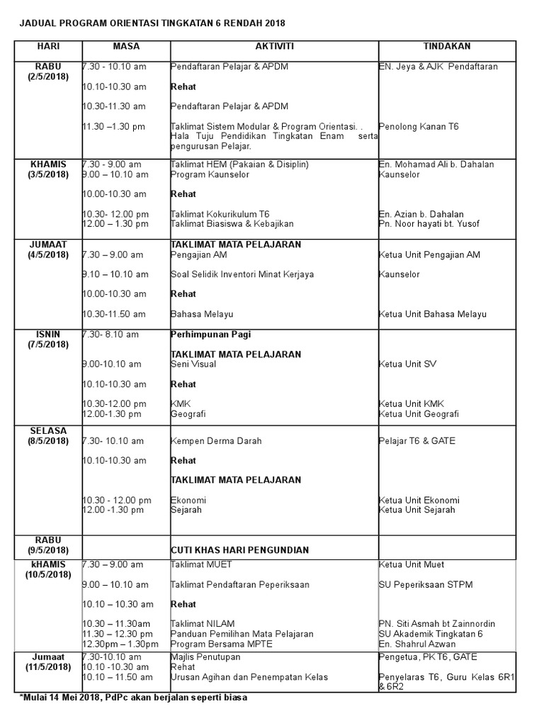 Jadual Program Orientasi Tingkatan 6 Rendah 2018