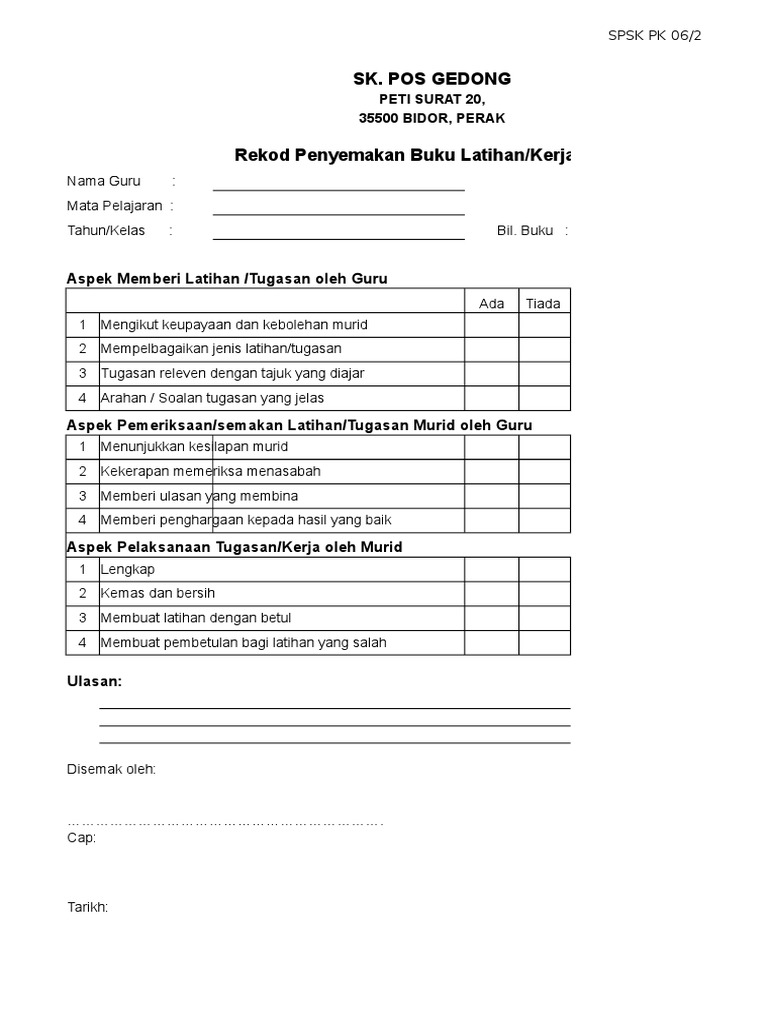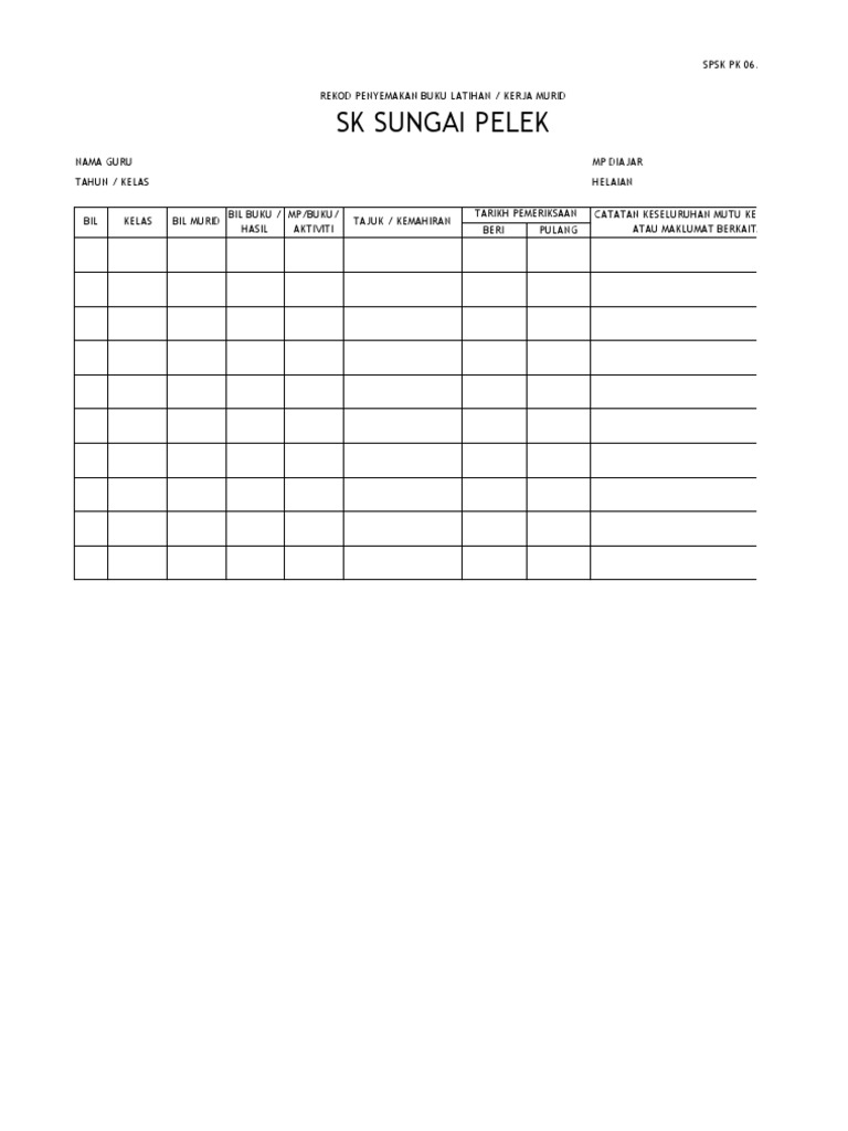 Borang spsk semakan buku. Kerja murid yang disahkan oleh pengetua gurubesar dan diedarkan kepada semua guru 5 5 mengumpul dan menyerahkan semua buku latihan murid dan melengkapkan borang untukdipantau oleh pentadbir mengikut jadual yang. Rekod anekdot ditulis secara objektif untuk menerangkan apa yang berlaku bila dan di mana sesuatu peristiwa itu berlaku. 5 9 memfailkan dokumen dan rekod semakan hasil kerja murid.