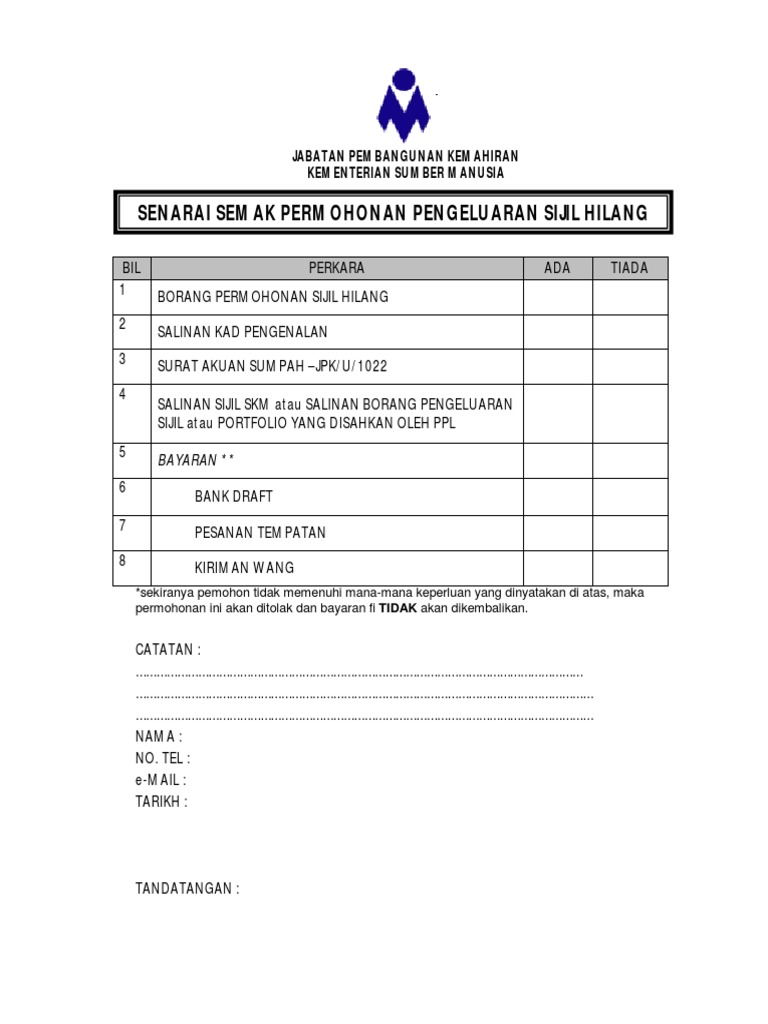 Senarai Semak Permohonan Pengeluaran Sijil Hilang