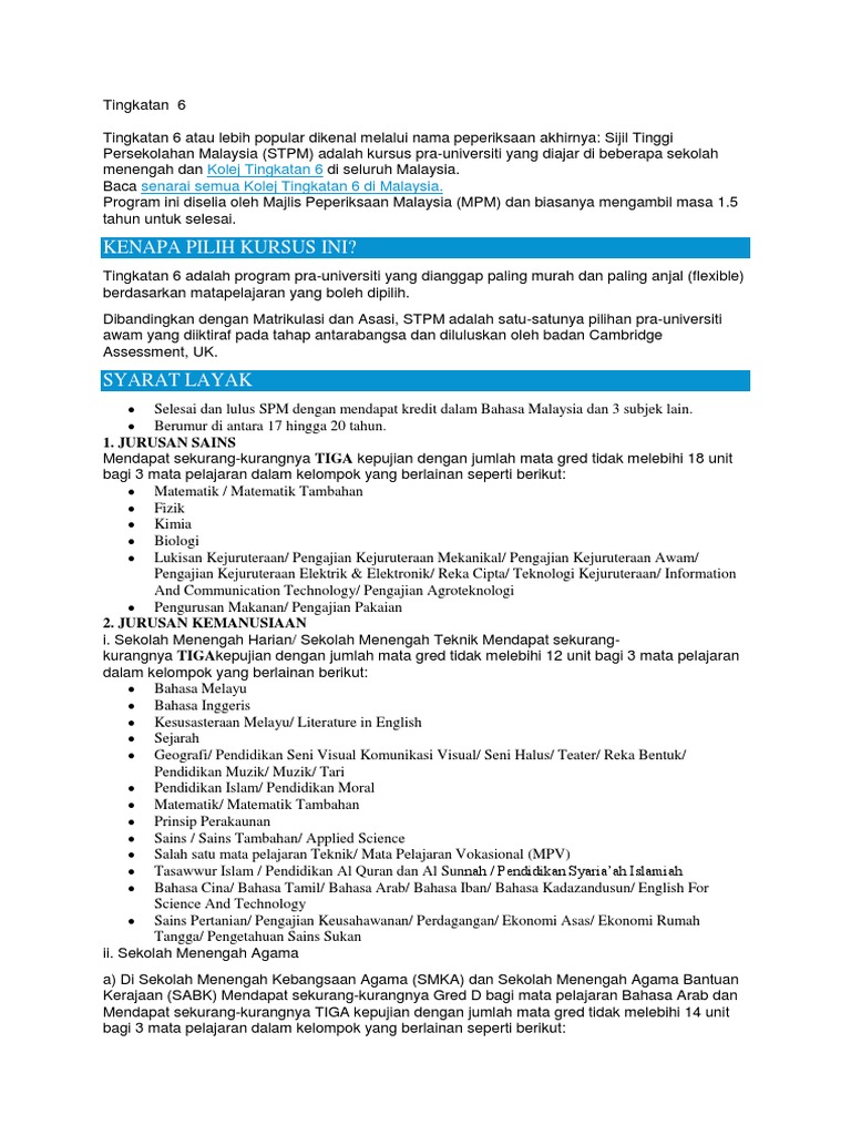 Syarat Kemasukan Tingkatan 6 Terkini Permohonan My