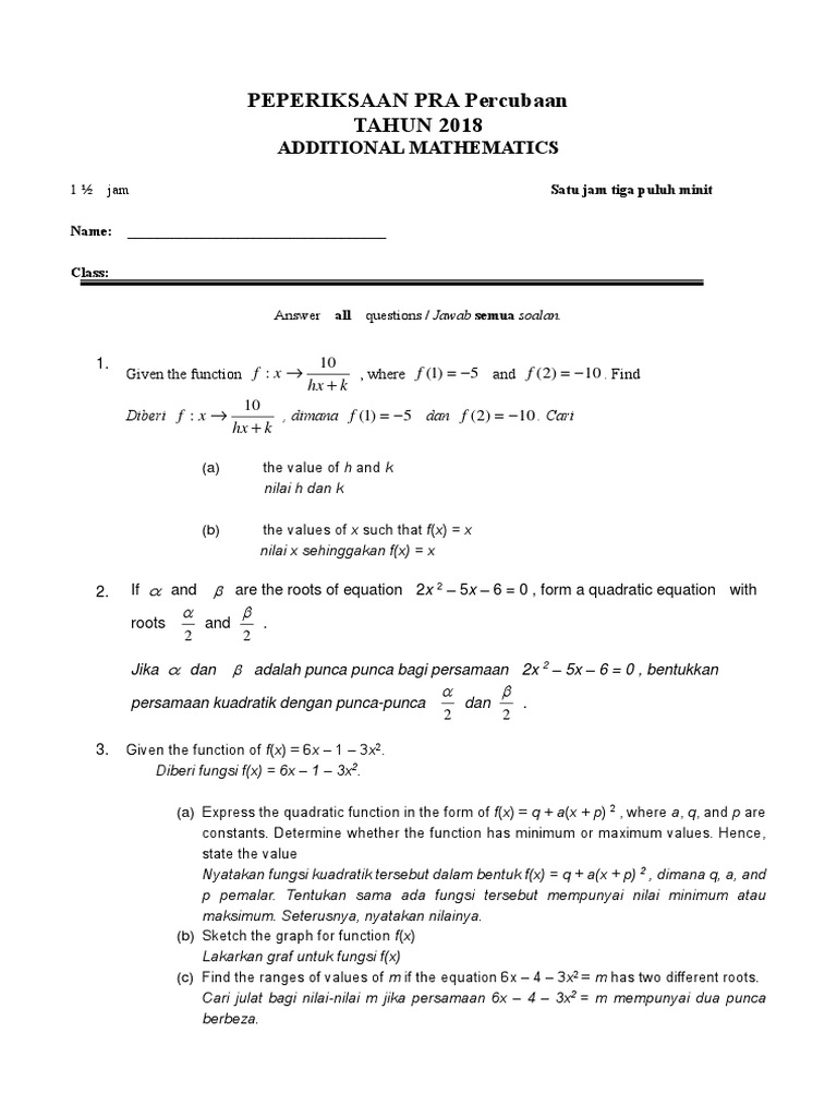 Kertas Soalan Matematik Tambahan Spm 2018 I Soalan