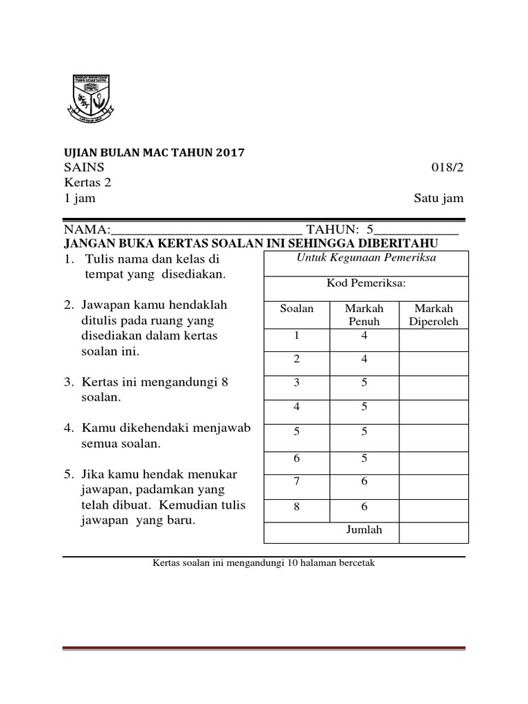 Soalan Sains Tahun 5 Pksr 2 Jalan Permata 2