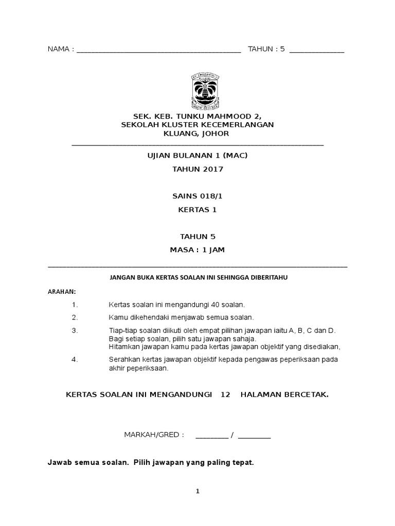 Soalan Sains Tahun 5 Kssr Ujian 1 Terengganu Q