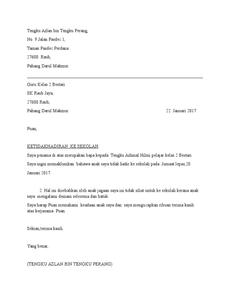 Surat Rasmi Tidak Hadir Ke Sekolah Surat Lettering Format