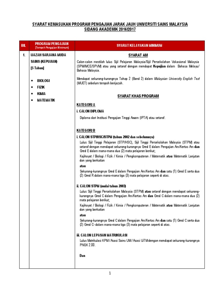 Syarat Kemasukan Ke Program Ijazah Physics Chemistry Lulus Stpm Matrikulasi Kpm Asasi Sains Dengan Mendapat Sekurang Kurangnya Pngk 3 50 Dan Pdf Document