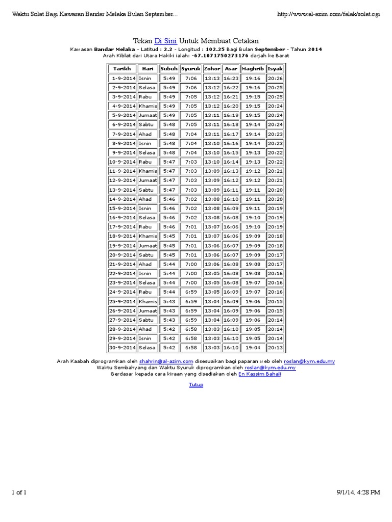 Waktu Solat Bagi Kawasan Bandar Melaka Bulan September Tahun 2014