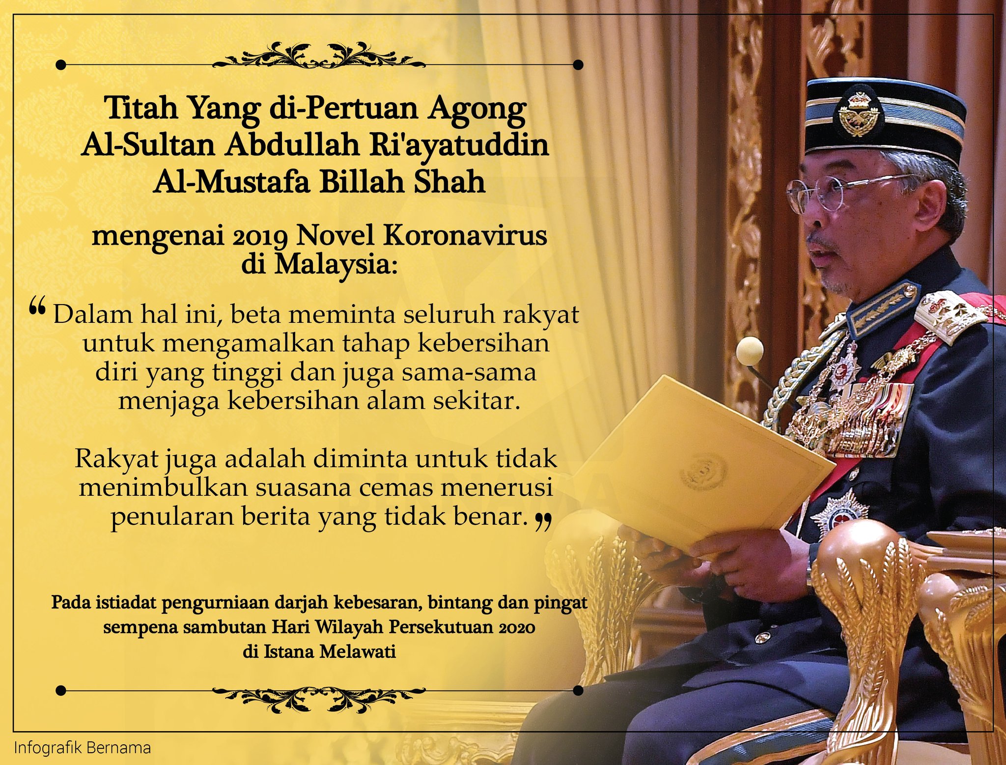 السلطان عبدالله رعاية الدين المصطفى بالله شاه الحاج ابن المرحوم سلطان حاج احمد شاه المستعين بالله born 30 july 1959 is the 16th yang di pertuan. Putrajaya titah nasihat serta keprihatinan yang di pertuan agong al sultan abdullah ri ayatuddin al mustafa billah shah terhadap kesejahteraan rakyat dengan sentiasa mengingatkan agar rakyat dari semasa ke semasa perlu menjaga kesihatan keharmonian dan keselamatan ketika negara berdepan penularan pandemik covid 19 amat dihargai rakyat sekalian. Umur 61 tahun adalah yang di pertuan agong malaysia ke 16 dan sultan pahang keenam. Al sultan abdullah bertitah baginda sangat menyanjung tinggi pelbagai usaha keras dan langkah berani yang telah dan bakal diambil oleh kerajaan untuk melindungi.